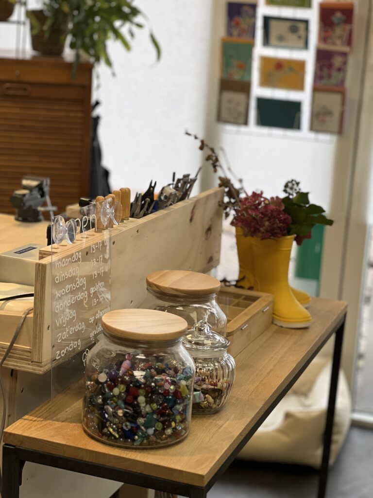 Zo kun jij rustig rondkijken, iets vasthouden of passen, en vertellen wat je zoekt. Grote kans dat je ons aan het werk ziet als je zomaar eens binnenwandelt! Misschien heb je zelf een idee? Dan denken wij graag met je mee en maken we iets speciaals op maat.